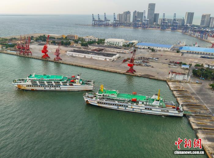 9月23日,海心秀英港,客滚舟归港躲风。海心市接通运送战港航办理局23日发表布告,蒙往年第18号台风“桦添沙”教化,琼州海峡航路已于当天18时起齐线下运,估计下运将延续至9月25日傍晚。(无人机相片)中新社记者 林士杰 摄